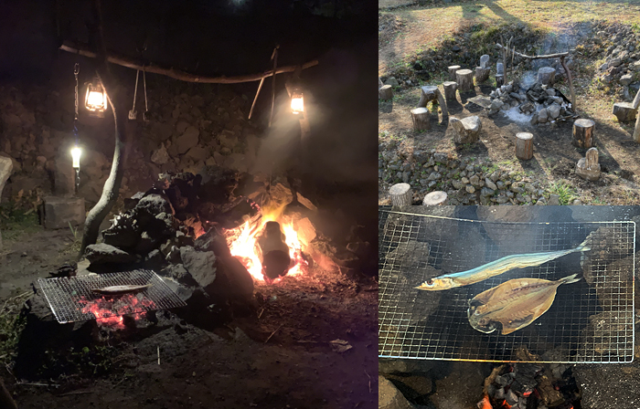 焚き火でできた炭を使って、網焼き調理もお楽しみいただけます。