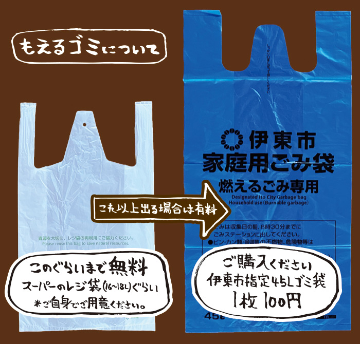 それ以上の量が出る場合は、伊東市指定45Lゴミ袋(1枚100円)をご購入ください。
